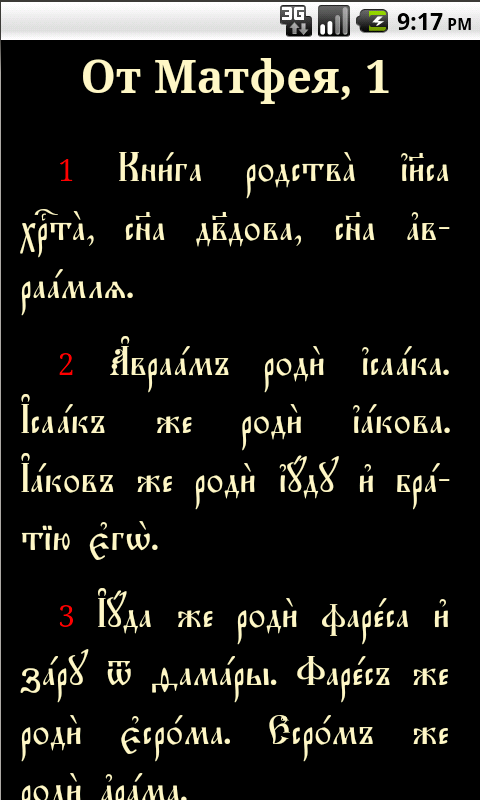 Wszystkie ustawienia dla tego programu odbywa się za pomocą menu. Jeśli twój telefon lub tablet nie widać przycisku menu można wywołać na inny. Dla stron z listy należy kliknąć na tytuł listy do stron z tekstem Ewangelii, trzeba kliknąć w lewym górnym rogu ekranu.