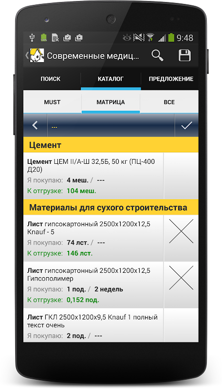 Aplikacja umożliwia tworzenie zamówień, przepisywania produktów, obejrzeć opis, ceny i salda towarów w magazynach, aby stworzyć ruch z magazynu do sali sprzedaży iz powrotem.