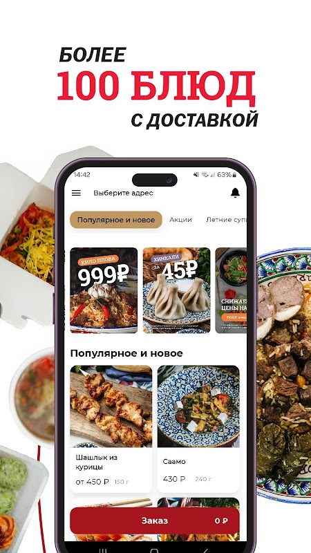 Tutaj możesz zamówić swoje ulubione posiłki z dostawą do domu lub biura w dowolne miejsce w mieście. W naszym menu znajdziecie grilla, manti, chinkali, prawdziwy uzbecki pilaw, bułki, steki, pierwsze dania i wiele więcej.