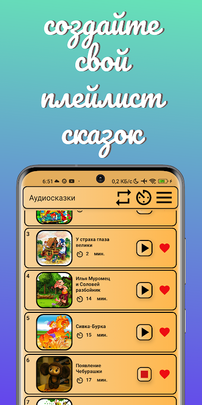 W aplikacji „Audio Opowieści. Opowieści na dobranoc” możesz zaznaczyć swoje ulubione bajki, a pojawią się one na osobnej liście „Ulubione” bajki.