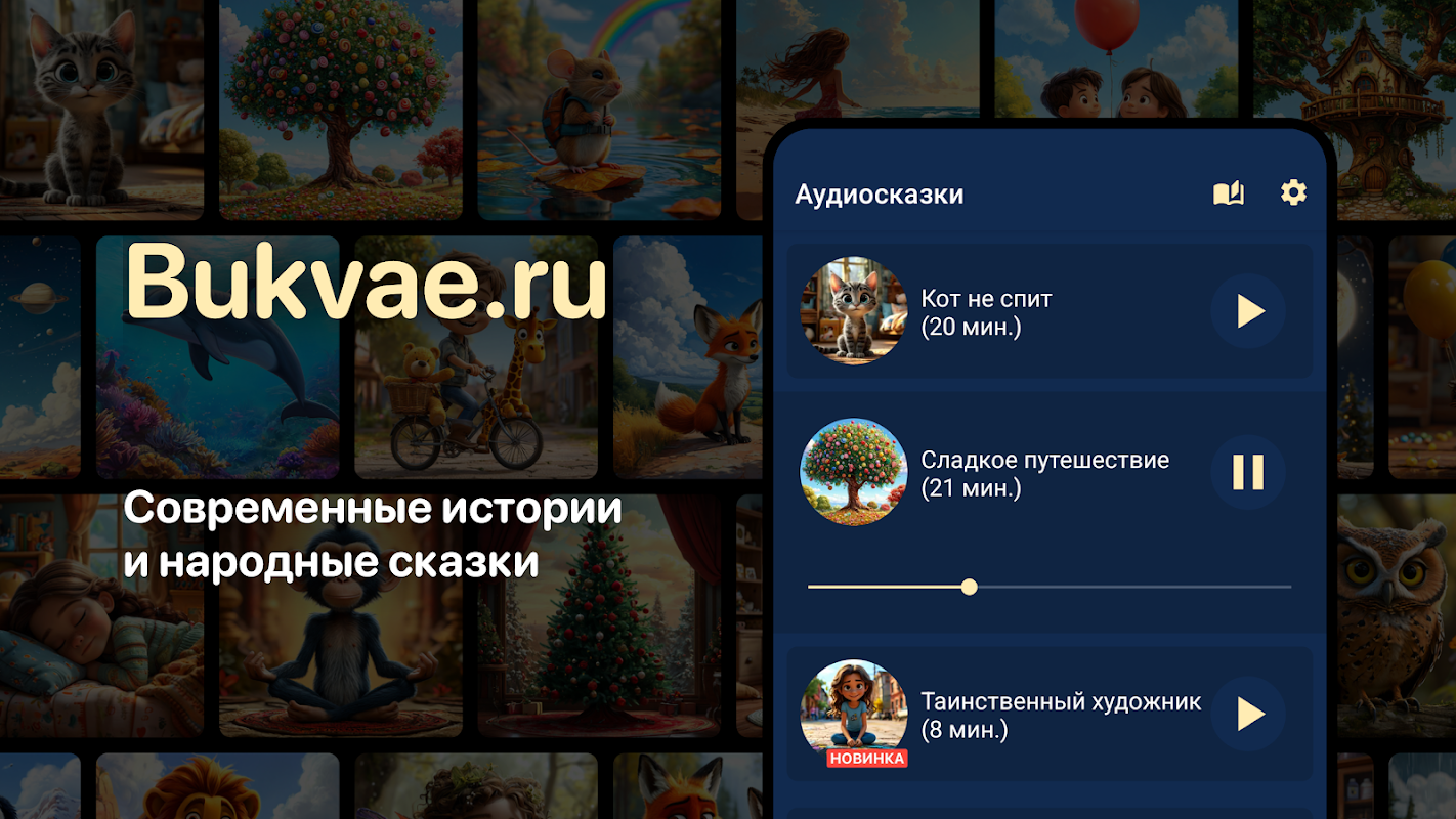 Bajki dla dzieci i rodziców Bukvae.ru - to bezpłatne bajki na dobranoc, opowieści audio i kołysanki dla całej rodziny. Tworzymy zbiór bezpłatnych opowiadań, opowiadań, książek i bajek w formacie radiowym dla dzieci. Nasze magiczne opowieści audio zostały stworzone przez tatę i nagłośnione przez mamę. Kojące kołysanki w tle, wciągająca fabuła i łatwe do zrozumienia teksty pomogą Ci zasnąć i zasnąć. Bardzo kochamy swoją pracę, dlatego bezpłatnie tworzymy wyłącznie wyjątkowe i wysokiej jakości bajki dla dzieci i ich rodziców. Możesz słuchać wszystkich książek dla dzieci i bajek na dobranoc za darmo i bez Internetu. W naszej aplikacji znajdziesz kołysanki dla chłopców i dziewcząt na każdy gust: opowieści dla dzieci o przyjaźni i podróżach, opowieści o odwadze i miłosierdziu, darmowe bajki o wróżkach i magii, książki o zwierzętach, bajka o przyjaźni i wiele innych małych audiobooków dla całej rodziny w formacie radiowym dla dzieci. Bajka żyje tutaj!