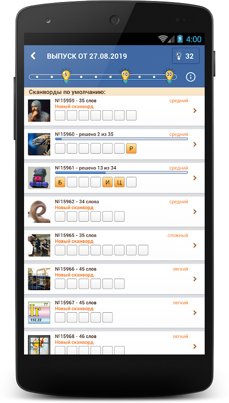 ⚙ Для загрузки новых ежедневных сканвордов необходимо соединение вашего мобильного устройства с Интернетом.