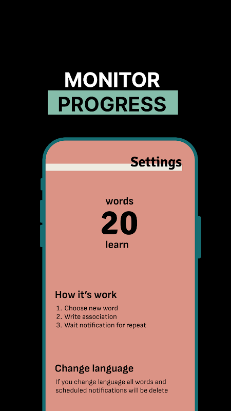 Наше мобильное приложение упрощает процессс изучения наиболее часто используемых слов английского я зыка. Мы объединили два эффективных метода - интервальное повторение и спользование ассоциаций. Для начала изучения выберите слово, создайте с ним ассоциацию, а приложение уведомит вас в нужные момент ы для повторения.