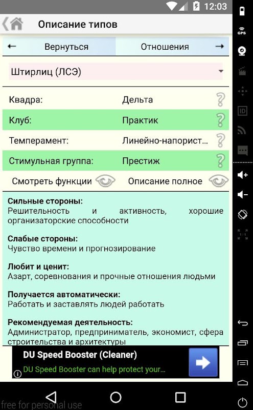 Это несложное приложение поможет вам не только больше узнать себя или понять свои сильные и слабые стороны. Оно также поможет вам понять свои стремления и поведение людей, их скрытые мотивы и возможности. Знание социотипов может пригодиться вам везде - от работы в коллективе, до любовного соблазнения...