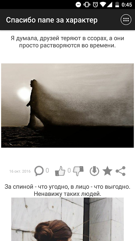 Понравившиеся записи можно комментировать и оценивать. Все понравившиеся картинки можно сохранять в галерее устройства в папке приложения. Ты можешь делиться записями с друзьями через социальные сети Facebook, Вконтакте, Одноклассники, Viber, WhatsApp а так же другие установленные на устройстве приложения. Ну и конечно, ты можешь оставлять лайки и сохранять записи в избранное.