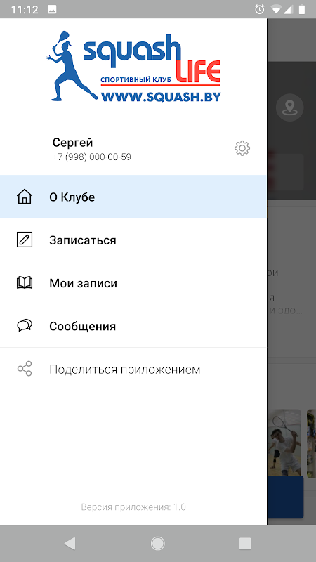 Aplikacja mobilna klubu sportowego "Squash-life" dla rezerwacji online kortów do squasha, pisanie do trenerów.