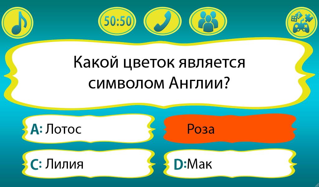 "50:50" - Из четырех вариантов ответа убирается два неправильных, тем самым упрощая вашу задачу выбрать правильный ответ из двух оставшихся вариантов;