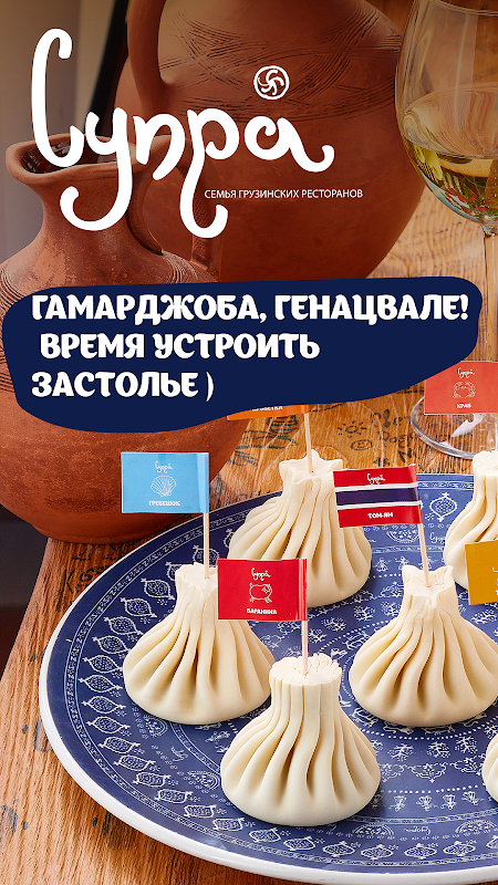 Najbardziej gruzińska aplikacja jest absolutnie niezbędna do prawdziwej genatsvale (Zhdunidze nie da złej rady)! Tylko za jego pomocą możesz zorganizować dostawę boskiego chinkali, chaczapuri i wszystkiego innego, a także zamówić odbiór doskonałych dań z Supry, jeśli Twój adres nie mieści się w zasięgu dostawy. Oprócz dostawy poprzez aplikację, możesz dołączyć do elektronicznej kolejki w restauracji (w promieniu 300 metrów), aby nie stać w prawdziwej kolejce, ale spokojnie i wygodnie poczekać w samochodzie, w kinie czy podczas spaceru. idąc wzdłuż nasypu.