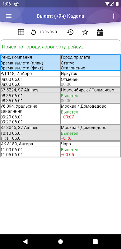 Statusy odlotów i przylotów lotniska Kadala (Chita), rozkład jazdy