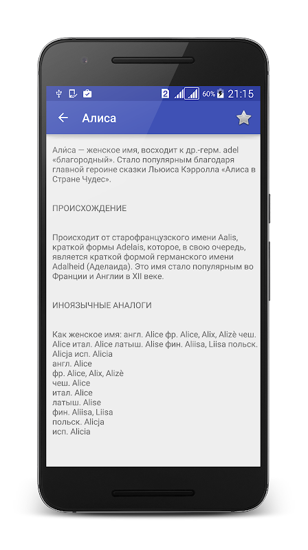 Мы рады вам предоставить большой справочник список женских имен. Каждому из нас порой интересно происхождение своего имени. А кто-то ждет рождения малыша и отчаянно думает как назвать будущего ребенка. В этом справочнике вы найдете огромный список женских имен, имена девочек. Приложение "Значение имени" сделано специально для вас. Тут имеется вся информация о разделе: имена и их значение. Кому- то будет интересно само толкование имени и судьба, а кто-то подчеркнет для себя происхождение и производные имени.
