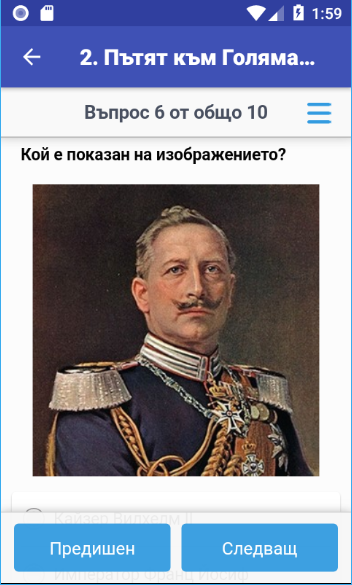 Każdy test zawiera 10 losowo wybranych pytań z 10 typów zadań (dla faktologii, chronologii, osobowości, obrazów, map, dokumentów itp.). Po zakończeniu wyświetlane są wyniki i poprawne odpowiedzi. Nowe otwarcie testu na lekcję generuje 10 nowych losowo wybranych pytań z bazy danych.