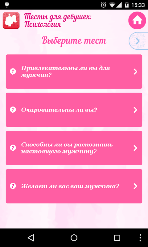 Вы наверняка уже успели повидать множество тестов для девочек, посвященных различным аспектам психологии. Приложение "Тесты для девушек: Психология" позволит вам получить огромное количество новых знаний себе и окружающих людях. Ежедневно тысячи женщин и девушек пользуются этими тестами, получая новые знания и применяя их на практике.