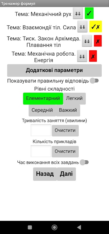 Za pomocą tego programu uczniowie mają możliwość wyboru i przestudiowania dowolnych wzorów z 4 tematów kursu fizyki 7. klasy. Aplikacja zapewnia poziomy trudności: Podstawowy, Łatwy, Średni, Trudny. Dla wygodniejszego użytkowania możesz skonfigurować dodatkowe parametry: Pokaż poprawną odpowiedź, Pokaż czas, Czas trwania lekcji i Liczba przykładów. Po zakończeniu pracy program pokazuje dane statystyczne, które pokazują skuteczność szkolenia w proporcjach ilościowych i procentowych.