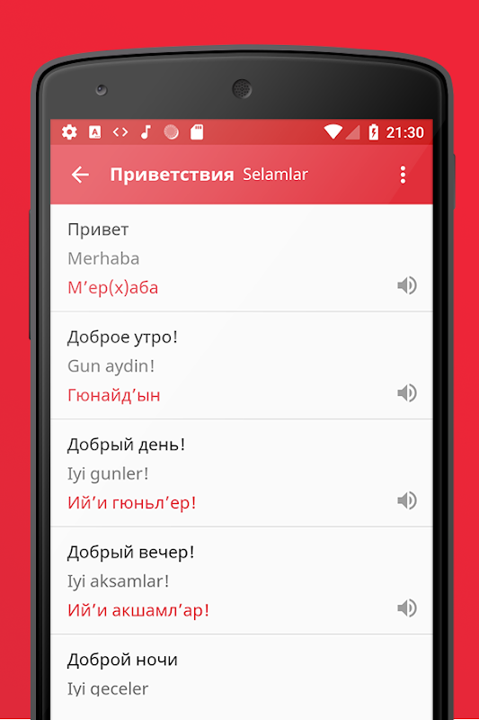 Aby nie pomylić się z wymową, możesz odtwarzać każdą frazę w aplikacji. Funkcja tureckiego słownika audio będzie bardzo przydatna w różnych sytuacjach. Na przykład, gdy nie możesz zrozumieć, jak wymówić słowo.