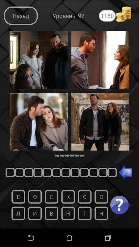 Zgadnij, która aplikacja oferuje styl słowny, aby sprawdzić swoją wiedzę filmową. Do uwagi gracza zostaną przedstawione 4 zdjęcia i tylko 1 nazwa tureckiej serii. Możesz nie tylko ciekawie spędzić wolny czas, ale także ćwiczyć mózg. Musisz zebrać wszystkie szczegóły, aby dowiedzieć się, która turecka seria ukrywa się za rebusem.