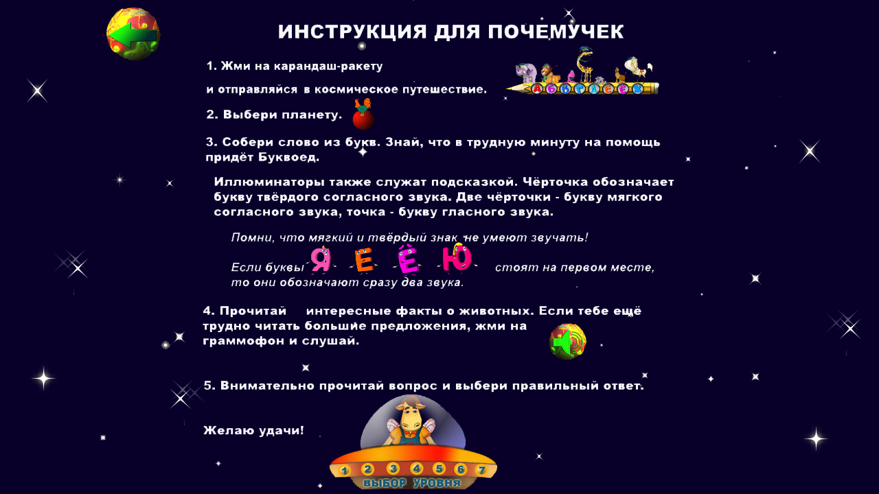 Naucz się czytać - Zwierzęta - jest opracowanie aplikacji dla dzieci i przedszkolaków, które opracowaliśmy specjalnie dla początkujących czytelników-pochemuchek. Idź do podróży kosmicznych na cud ołówkiem. Odwiedzimy świat: ryby, zwierzęta morskie (żółwie morskie, ośmiornice, meduzy), owady, pajęczaki (pająki), gady, ptaki i ssaki, i dowiedzieć się o niesamowitym świecie zwierząt, ponieważ Ziemia jest pełna cudów. Ta encyklopedia interaktywnej rozrywki powita cię z nowej wiedzy. Zapewnia zoologii i przyrody, która ukrywa swoje tajemnice. Mamy wiele ciekawych zadań o różnym stopniu złożoności spodziewać.