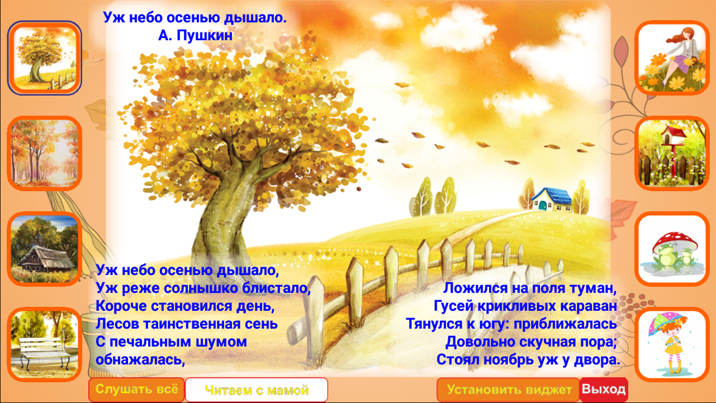 В нашей развивающей игре Ваш ребенок сможет самостоятельно выучить стихотворения про осень в садик или начальную школу.