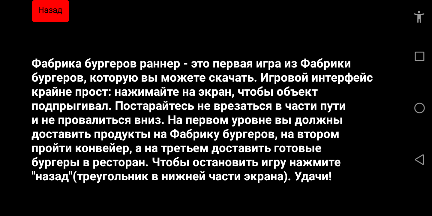 Вашему вниманию представлена игра "Фабрика бургеров раннер". Это первая, но не единственная игра на тематику Фабрики бургеров у данного разработчика. Управление в игре крайне простое: нажимайте на экран и проходите уровни.