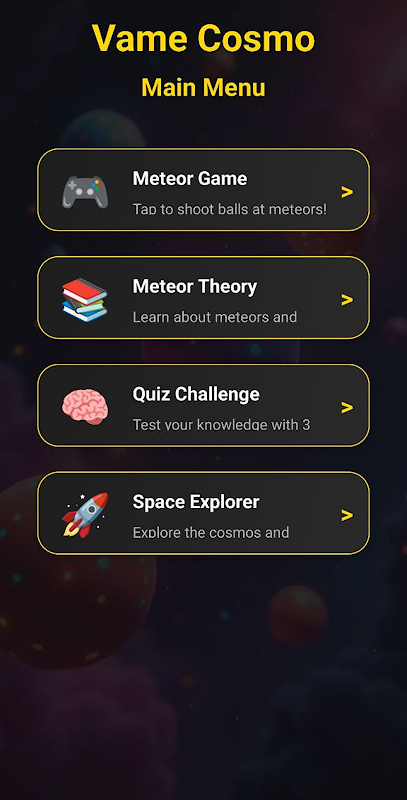 Vame Cosmo wita użytkowników intuicyjnym procesem wdrażania, który przedstawia kluczowe funkcje za pomocą serii kart informacyjnych. Nawigacja jest płynna, a menu główne podzielone jest na cztery sekcje: Space Explorer, Meteor Game, Quizy i Teoria. Ta struktura wspiera zarówno swobodną eksplorację, jak i skupioną naukę.
