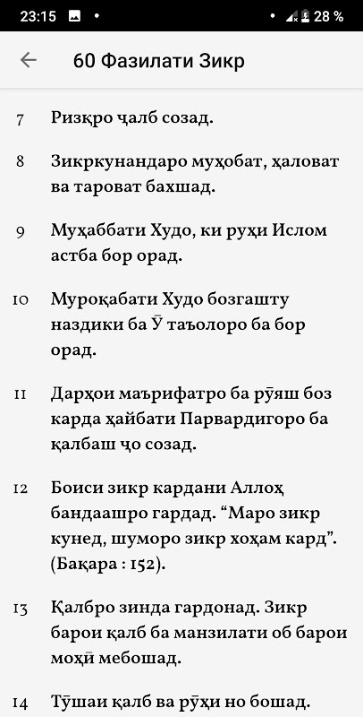„Alloҳthaolo winter inat bandagoni mądrze farmudaast, ki ai bandagoni man! Maro bo itoatu ibodat ёd Kunun! Man shumoro bo savob dodanu mafirat namudan ed mekunam. On jest nematҳoero, ki man ba shumo arzonш doshtaam, onoro nodida nagired, dar muobili onҳo masiyat nakuned va shukronai maro gued! Pompatyczna omeda, ki Muso (a) guftand: „ё rabbӣ chӣ hel shukronai Turo bau о oram?” ovardӣ! Wa ҳarvaқto, ki maro farӯӯӯ sozӣ, dar ҳaқiқat nosipos ҳastӣ! ”