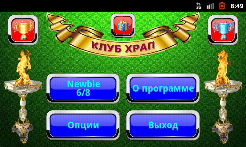 Азартная карточная игра "Храп", популярная в России. В программе реализован практически полный набор правил: здесь можно "Храпеть", "Веселить", "Помогать", "Грустить" и объявлять "Обяз". Однако нельзя "Идти в 5 карт": если все игроки отказались помогать, Банк забирает Храпун. Кроме того, пока в программе реализован только режим закрытого козыря: козырь объявляет Храпун или Весельчак. Сыграв 300 конов при хорошем счёте игрок попадает как в локальную таблицу чемпионов, так и в мировую. Можно выбрать одну из трех любимых советских колод: Атласную, Майя или Славянскую. Требуется размер экрана 800x480 или лучший. Поддерживаемые языки: English + Русский.