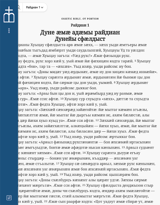 Уазфысты Чингуытӕ Ирон ӕвзагыл - уый у Хуыцауы Дзырд, иудадзыг уӕ разы уӕвӕг. Уӕлӕмхасӕн мах барӕй фӕхуымӕтӕгдӕр кодтам, цӕмӕй уӕ ӕппындӕр мацы хуыцауы Дзырдмӕ уӕ хъус лӕмбынӕг ӕрдарынмӕ. Уӕлӕмхасӕны интерфейсы фӕрцы Библийыл ис ӕнцонӕй ӕрзилӕн ӕмӕ хъӕугӕ бынӕттӕ уайтагъд ссарӕн. Уӕлдай хорз та уымӕй у, ӕмӕ ӕнӕ интернетӕй дӕр автономон ӕгъдауӕй кӕсыны фадат дӕтты.
