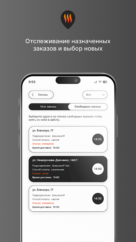 - Pokazuje wszystkie dostępne zamówienia w ramach działalności kuriera