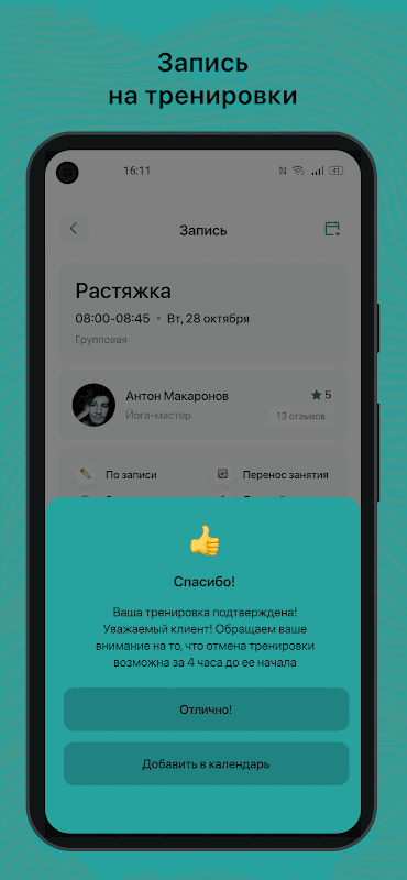 - Otrzymuj powiadomienia PUSH o nadchodzącym treningu z 3-godzinnym wyprzedzeniem;
