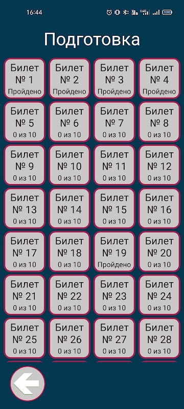 - szkolenie - Każdy bilet zawiera 10 pytań. Wszystkie pytania ułożone są w losowej kolejności, więc nie będziesz w stanie zapamiętać odpowiedzi na podstawie ich lokalizacji. Jeśli użytkownik pomyli się w odpowiedzi, zobaczy właściwą opcję.
