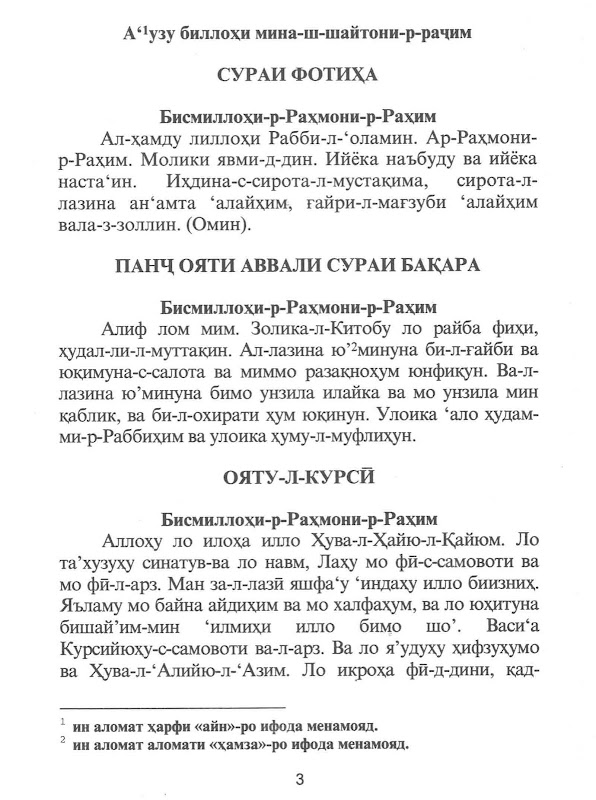 Сураҳо, Қуръон, Намоз, Ёсин, Таборак, Фотиҳа, Сураи НОС (Мардум), Сураи ФАЛАҚ (субҳгоҳ), Сураи Ихлос, Сураи ЛАҲАБ (Оташ), Сураи Наср, Сураи Кофирун, Сураи Кавсар, Сураи Моъун, Сураи Қурайш, Сураи Фил, Сураи ҲУМАЗА (Айбҷӯ), Сураи АСР (Замон), Сураи ТАКОСУР (Афзунхоҳӣ), Сураи ҚОРИЪАҲ (Кӯбанда), Сураи ОДИЁТ (Аспони даванда), Сураи ЗИЛЗОЛ (Ларзиш), Сураи БАЙЙИНА (Бурҳони равшан), Сураи ҚАДР (Тақдир), Сураи ТИН (Анҷир), Сураи Иншироҳ, Сураи ЗУҲО (Оғози рӯз), Сураи ЛАЙЛ (Шаб), Сураи ШАМС (офтоб), Сураи ТОРИҚ (Он чӣ дар шаб ояд), Сураи Ъамма (Хабар), Сураи Таборак, Сураи Ёсин