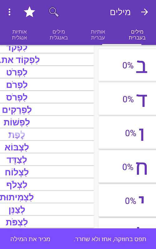 מאגר מילים - מאגר ענקי של מילים, מסודר לפי האותיות עם יכולת לעקוב אחר ההתקדמות שלך, ניווט קל ומהיר בין המילים.