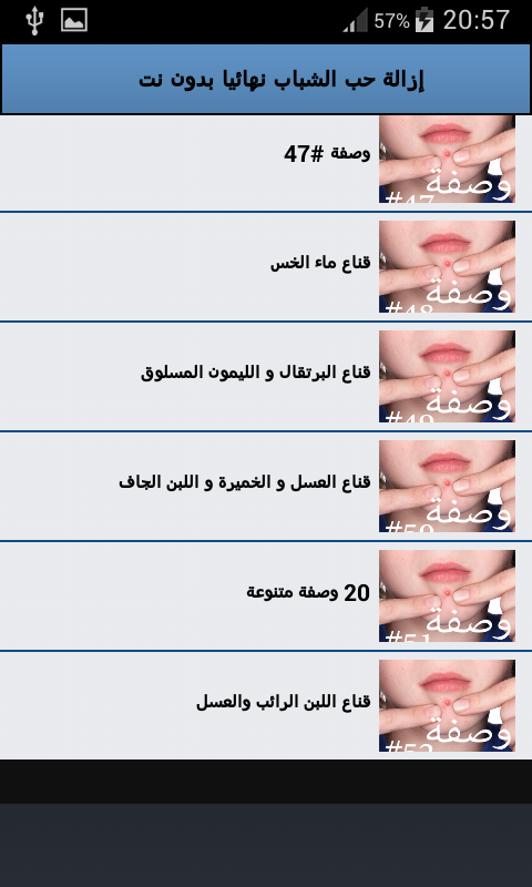 يحتوي التطبيق على عدة وصفات طبيعية تهتم بإزالة حب الشباب ومتجددة بستمرار و هذه بعضها :