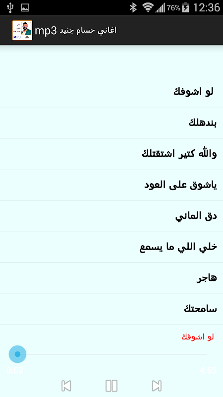 تطبيق ( اغاني حسام جنيد mp3 ) يمكنك من الإستماع لجميع أغاني المغني السوري الشهير حسام جنيد بجودة صوت عالية وبصيغة mp3 .