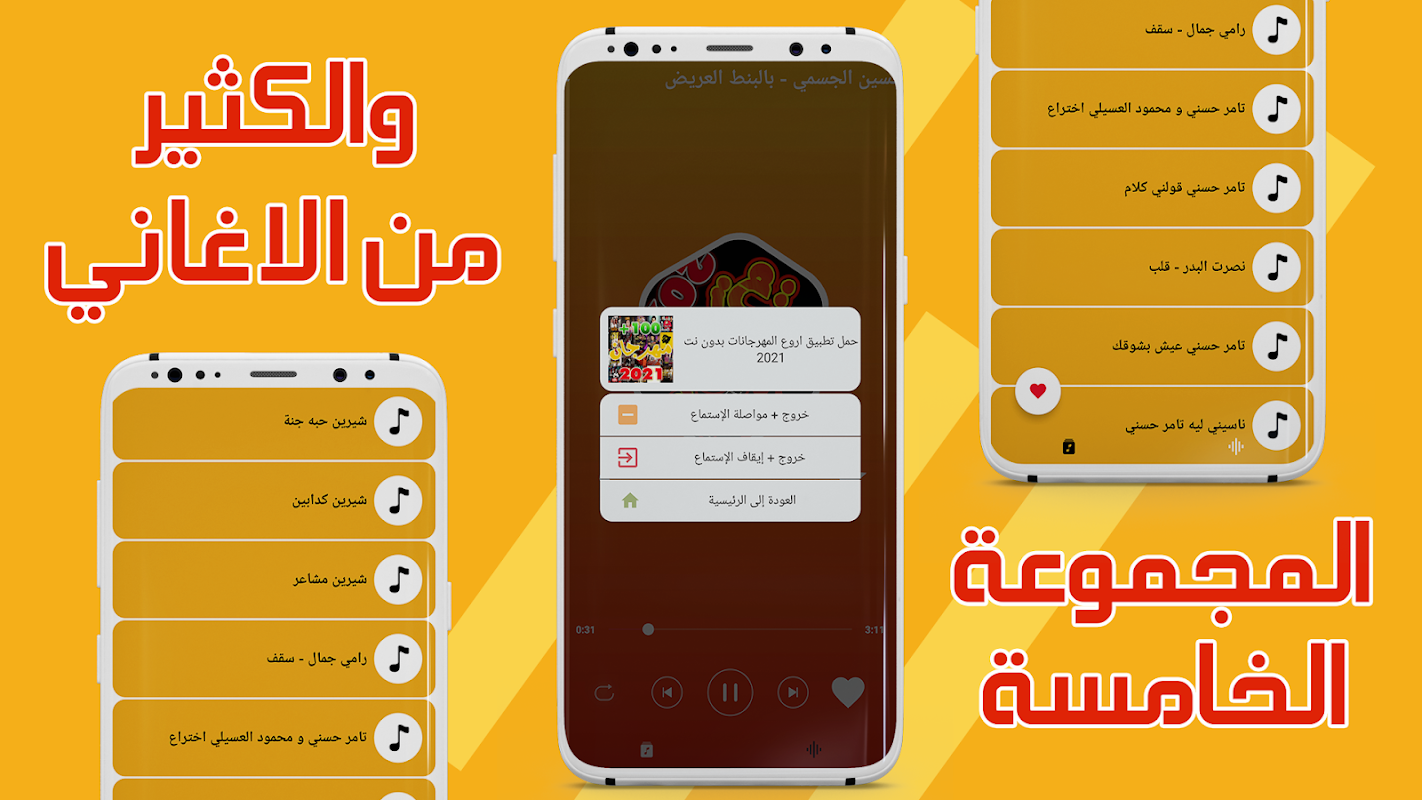 Dzięki tej aplikacji możesz słuchać najlepszych nowych i starych egipskich piosenek, w tym piosenek Amra Diaba, piosenek Muhammada Ramadana, piosenek Mustafy Al-Hajj, piosenek Nancy Ajram, piosenek Ahmeda Al-Shiby , piosenki z Cairokee, piosenki z festiwali Hassan Shakush, piosenki z festiwali Nour Al-Tout, piosenki Bossi, piosenki Mahmouda El-Laithy'ego, piosenki Hamady Hilala, piosenki festiwalowe Hamo Beki i piosenki Hamaki. Są to nowe egipskie piosenki bez sieci, piosenki o miłości i uczuciach, romantyczne piosenki, które zaspokoją wszystkie gusta. Zastosowanie różnych egipskich piosenek bez sieci 2022 daje nowe piosenki miłosne bez sieci. Wszystkie utwory można pobrać w tej aplikacji i nie potrzebują Internetu. Dla wszystkich, którzy chcą smutnych piosenek lub chcą popularnych egipskich piosenek 2022 bez sieci, ponadto aplikacja jest odnawiana i jest stale aktualizowana w celu uzyskania nowych egipskich piosenek 2021.