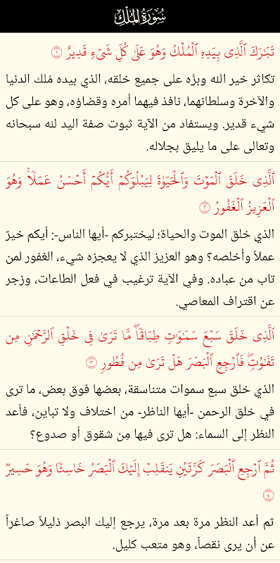 Święty Koran jest kompletny bez połączenia z Internetem i jest całkowicie identyczny z papierowym Koranem z narracją Qaluna, funkcją przeszukiwania Świętego Koranu, łatwą i łatwą interpretacją w dziwnej części Świętego Koranu „an, znaczenie słownictwa, błagania ze Świętego Koranu, błaganie o zakończenie Świętego Koranu, możliwość ustawienia znaku i powrotu do niego później, indeks sur, indeks części, części, i ćwiartek oraz kontrola stopnia jasności. Ekran i tryb odczytu znajdują się w trybie nocnym i czytają w trybie poziomym i pionowym. Jeżeli program zostanie zamknięty na określonej stronie i ponownie otwarty, automatycznie przejdzie do strony, na której został zamknięty, a program będzie dbał o to, aby ekran był podświetlony dla tych, którzy chcą czytać dalej przez dłuższy czas, a czcionka jest wyraźna, a kolor tła stron wygodny dla oka.
