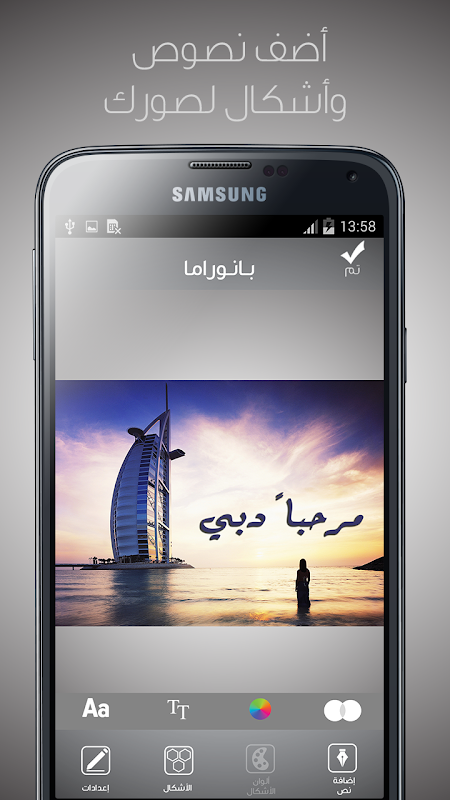 - إضافة النصوص العربية و الإنجليزية على الصورة.