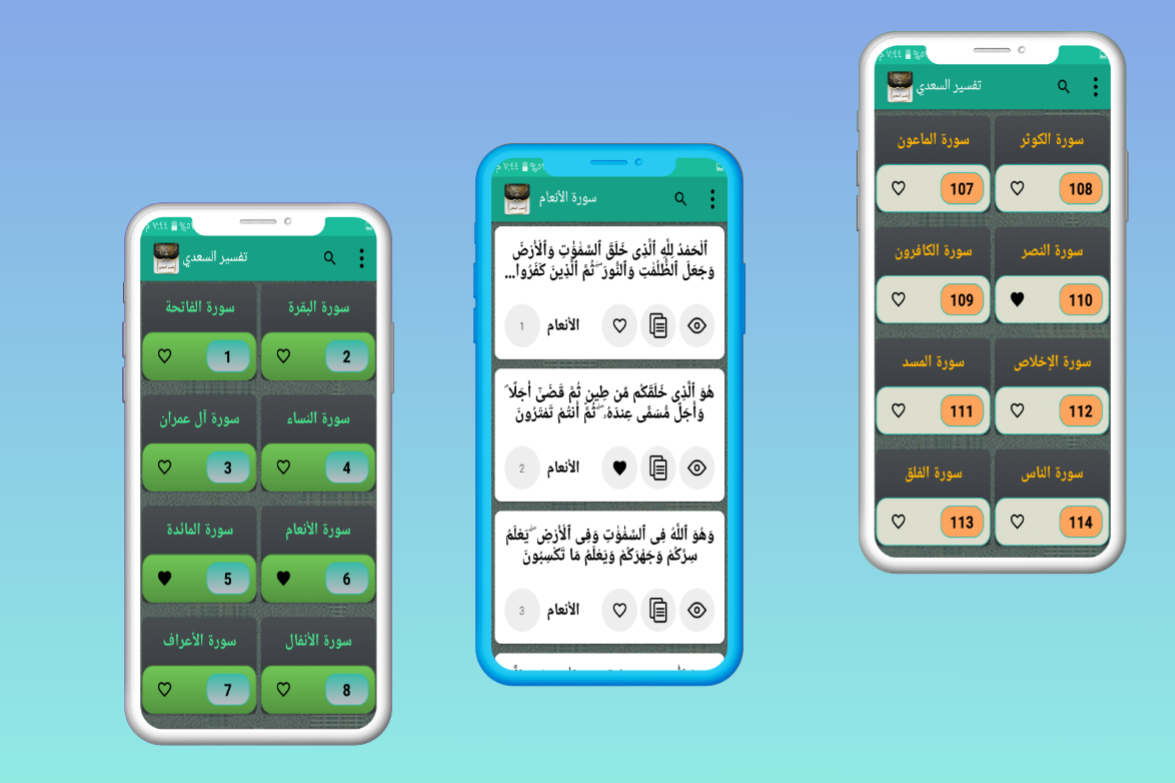 ◉ Boczne menu zawierające wszystkie wersety sury do szybkiej prezentacji i przechodzenia między nimi.