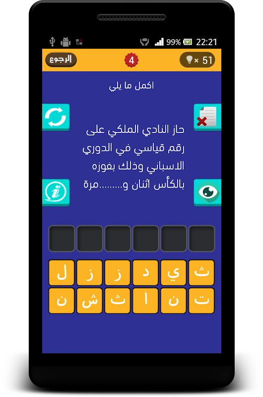 تطبيق لعبة وصلة ريال مدريد - رشفة أسئلة وأجوبة بدون انترنت هو برنامج ترفيهي رياضي هو تطوير للعبة الكلمات المتقاطعة الشهيرة يضم جملة من الاسئلة الرياضية مصحوبة بصور للاعبين قداما و جدد مثل النجم رونالدو والأسطورة زين الدين زيدان المتعلقة بفريق real madrid مبرمجة في تصميم جميل يحمل الوان الفريق القومي الاسباني و شكل حديث يتماشى ومتطلبات كل الشرائح العمرية شباب وكبار و حتى الصغار ليختبر الرصيد المعرفي الرياضي لديك و يحفز الذاكرة عندك.