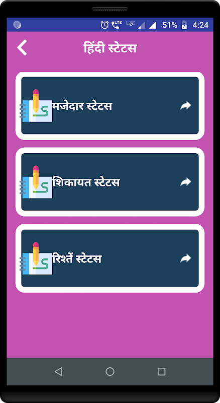 W ramach tej aplikacji można znaleźć dobrze skategoryzowaną kolekcję hindi Shayari i stanu hindi, którą można udostępniać znajomym.