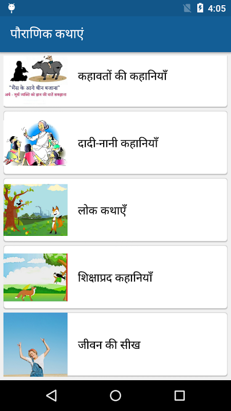 Huge collection of indian hindi stories( hindi kahaniya). Stories are are way to pass the gainful information to our next generations. This app contain big collection of indian hindi stories, which every one should know and pass it to our next generation. These stories are not only for entertainment but are the source of knowledge and information. You will know indian culture more nearly after reading all stories. if you will really like "Hindi Kahaniya" app, Please take a moment to rate this app. All suggesstions are welcome.