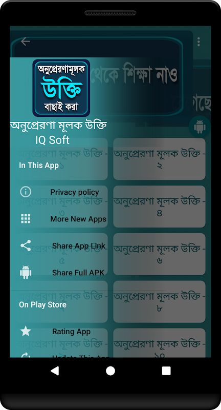এই অ্যাপ টিতে থাকছে অনুপ্রেরণা মূলক উক্তি বা বাণী এবং এর সাথে আরও থাকছে ইসলামিক বাণী ও ইসলামিক উক্তি এবং গুণীজন দের কথা, এটি একটি ইসলামি ও অনুপ্রেরণা মূলক উক্তি ও বাণী বাংলা অ্যাপ, উক্তি বা বানী যা আমাদেরকে প্রভাবিত করে, বিখ্যাত মণীষীদের অনুপ্রেরণামুলক উক্তি বা বানী যা আমাদের বিশ্বাস বাড়াবে এবং বদলে দিতে পারে আমাদের জীবনকেও, আমরা আনুকরন ও আনুসরন করব তাদেরকে, জারা ছিল বিখ্যাত ও মহান, হুমায়ুন আহমেদের নেলসন ম্যান্ডেলার আইনস্টাইনের রবীন্দ্রনাথ ঠাকুরের হুমায়ূন আজাদ এর কাজী নজরুল ইসলাম এর এপিজে আব্দুল কালামের হযরত আলী (রাঃ) এর হেলাল হাফিজ এর বন্ধুত্ব উপদেশ মূলক অনুপ্রেরণামুলক বাণী ও উক্তি, ভালোবাসার প্রেমের উক্তি ও বাণী, প্রবাদ বাক্য জীবন বদলে দেয়া উক্তি ও বাণী।