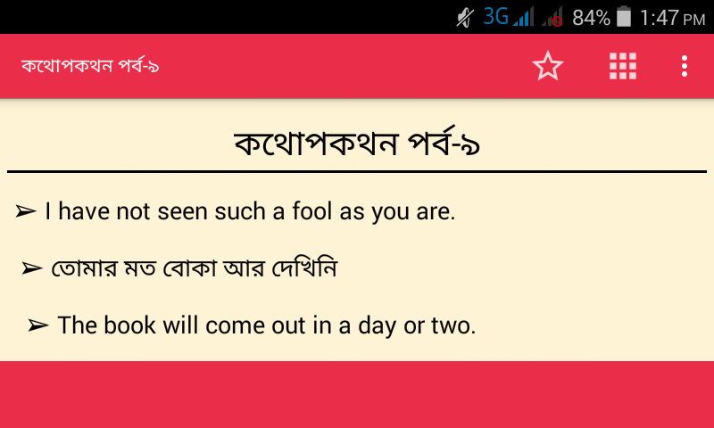 বাংলা থেকে ইংরেজি এবং ইংরেজি থেকে বাংলায় প্রতিদিনের ব্যবহৃত অফিসে, কর্মস্থানে, বাসা-বাড়ীতে এবং চলার পথে ১,৫০০ গুরুত্বপূর্ণ বাক্যের অনুবাদ।