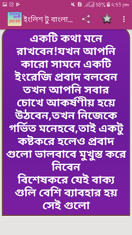 This app provides best collection of favorite and regularly saying proverbs for English and Bengali speakers (proverb in english to bangle, proverbs in English). One can enhance the skill of speaking by uttering these proverbs (proverbs in english to bengali, probad bakko বা প্রবাদ বাক্য). By saying proverbs (english probed), anyone can easily attract the attention of others.