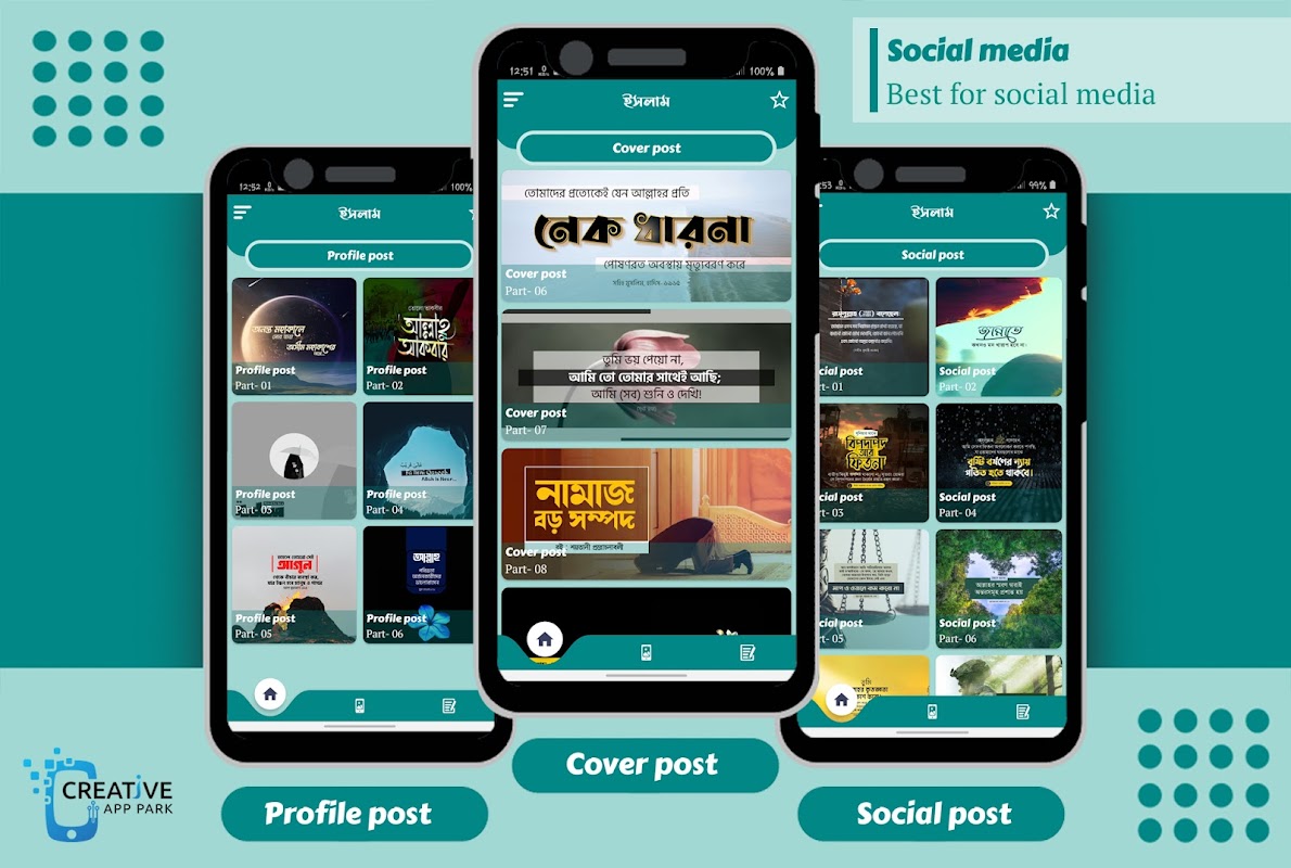 বিশেষ দ্রষ্টব্যঃ- অ্যাপের টাইপোগ্রাফি ইসলামিক পিকচার গুলোর ডিজাইন হালাল-হারামের সীমারেখা মেনেই করার চেষ্টা করেছি এবং ইসলামের প্রচার ও প্রসারের চাহিদা থেকেই আমাদের এই।। অ্যাপে থাকা ইসলামিক পোস্ট এর ছবি গুলোতে ইসলামের ঐক্য বিনিষ্ট হয় এমন বানী বা উক্তি, রাজনৈতিক পোস্ট অথবা বিতর্কিত হতে পারে এমন হাদীস ও কোরআনের আয়াত বা ইসলামিক কোন ফতোয়া প্রদান করা হয়নি। উল্লেক্ষ্য যে, ইসলামিক পোস্ট অ্যাপটিতে সহিহ হাদিস, কোরয়ানের আয়াত এবং নবীদের জীবন কাহিনী থেকে রেফারেন্স এবং ব্যাখ্যা দিয়ে ইসলামিক ছবি ও ক্যাপশন গুলোর ডিজাইন করা হয়েছে যাতে করে কোন প্রকার বিভ্রান্তির সৃষ্টি না হয়।