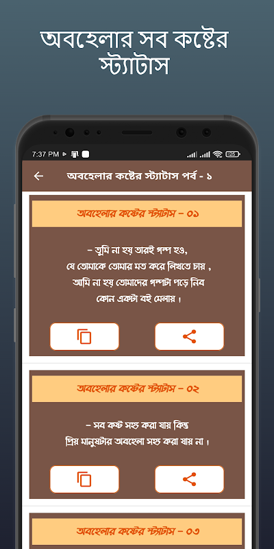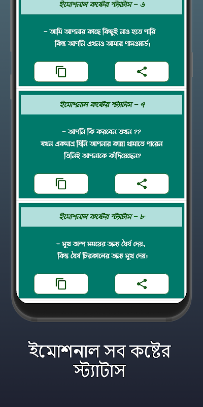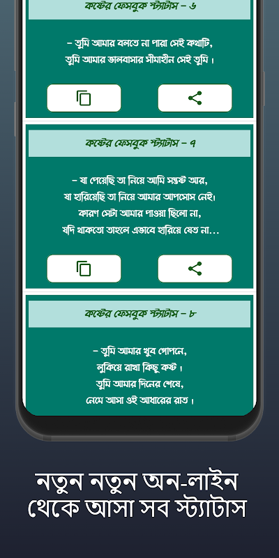 কষ্টের স্ট্যাটাস, আবেগি স্ট্যাটাস ও বেইমানির নতুন নতুন সব ভাইরাল স্ট্যাটাস পাবেন এই অ্যাপের মধ্যে। অ্যাপটি আপনি অনলাইনেও ব্যবহার করতে পারবেন এবং অফলাইনেও ব্যবহার করতে পারবেন।