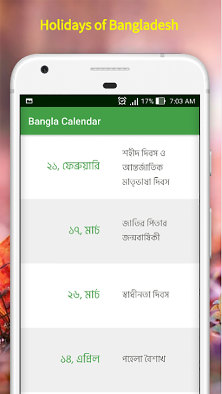 This Bangla Calendar comes with very good home screen. You will have in this application Bengali Month, current Bengali year along with Gregorian Calendar details and Bangladesh Holidays for the year of 2019.