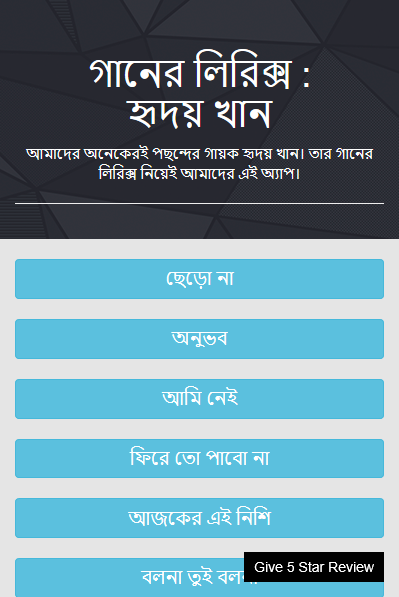 আমাদের অনেকেরই পছন্দের গায়ক হৃদয় খান। তার গানের লিরিক্স নিয়েই আমাদের এই অ্যাপ।