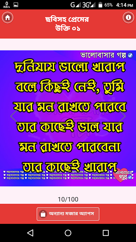 ছবিতে রোমান্টিক ভালবাসার উক্তি নিয়ে ডেভেলপার টীম WikiBdApps একটি অসাধারণ অ্যাপ ডেভেলপ করেছে। এগুলো স্ট্যাটাস হিসেবেও দিতে পারবেন।