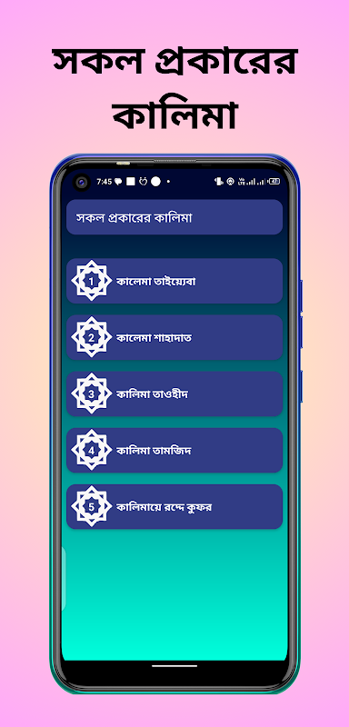 Aplikacja নূরানী নামাজ শিক্ষাapp zawiera pięć wymowy Kalima w języku arabskim i bengalskim z tłumaczeniem na bengalski, pięć plików audio Kalima można słuchać w trybie offline.