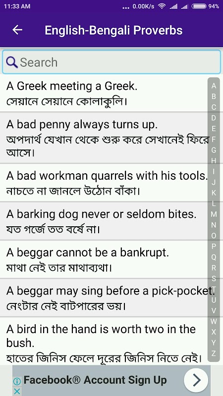 - Przeglądaj przysłowie według alfabetu angielskiego lub bengalskiego